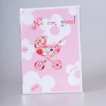 - Ροζ κάρτα με λευκά λουλούδια και καρότσι