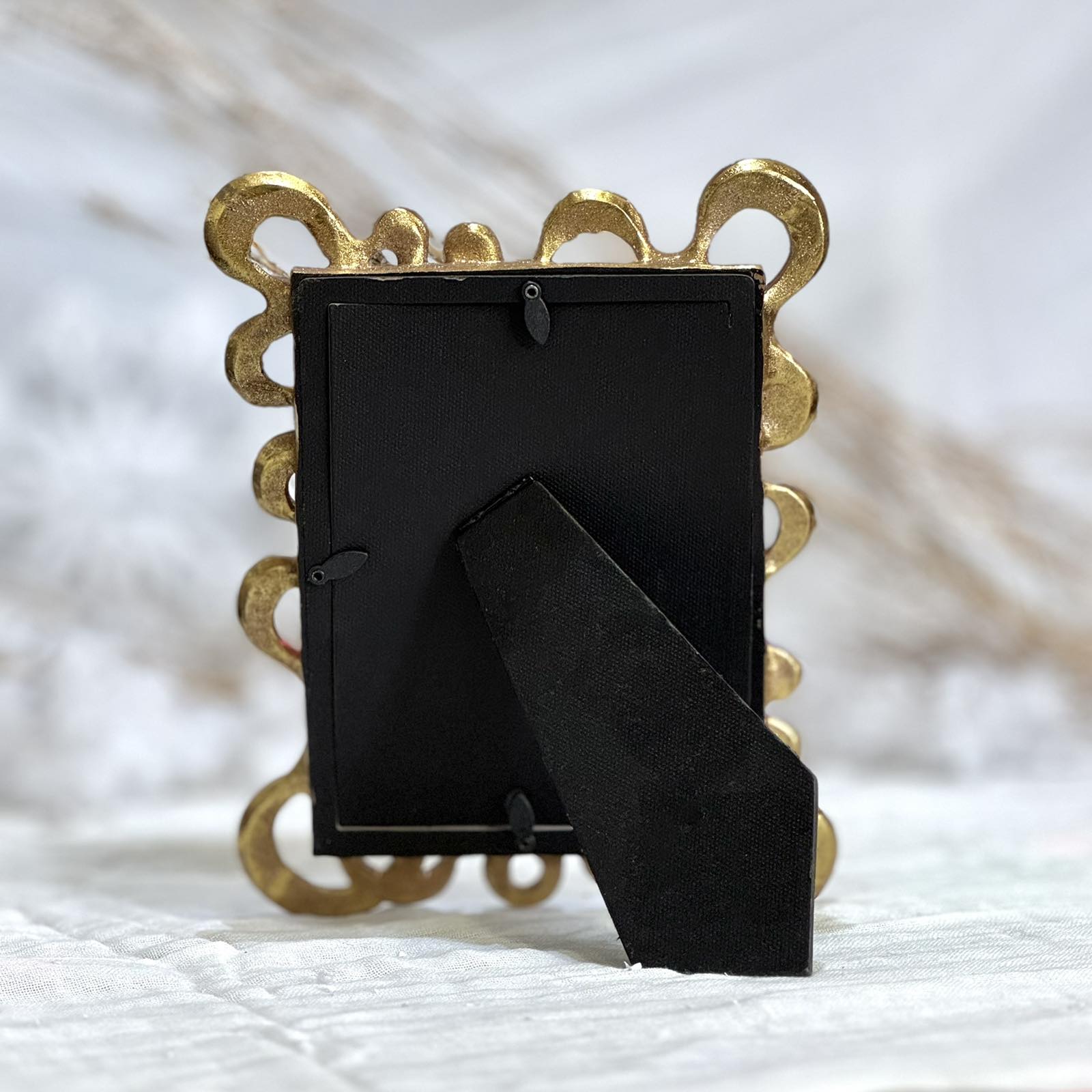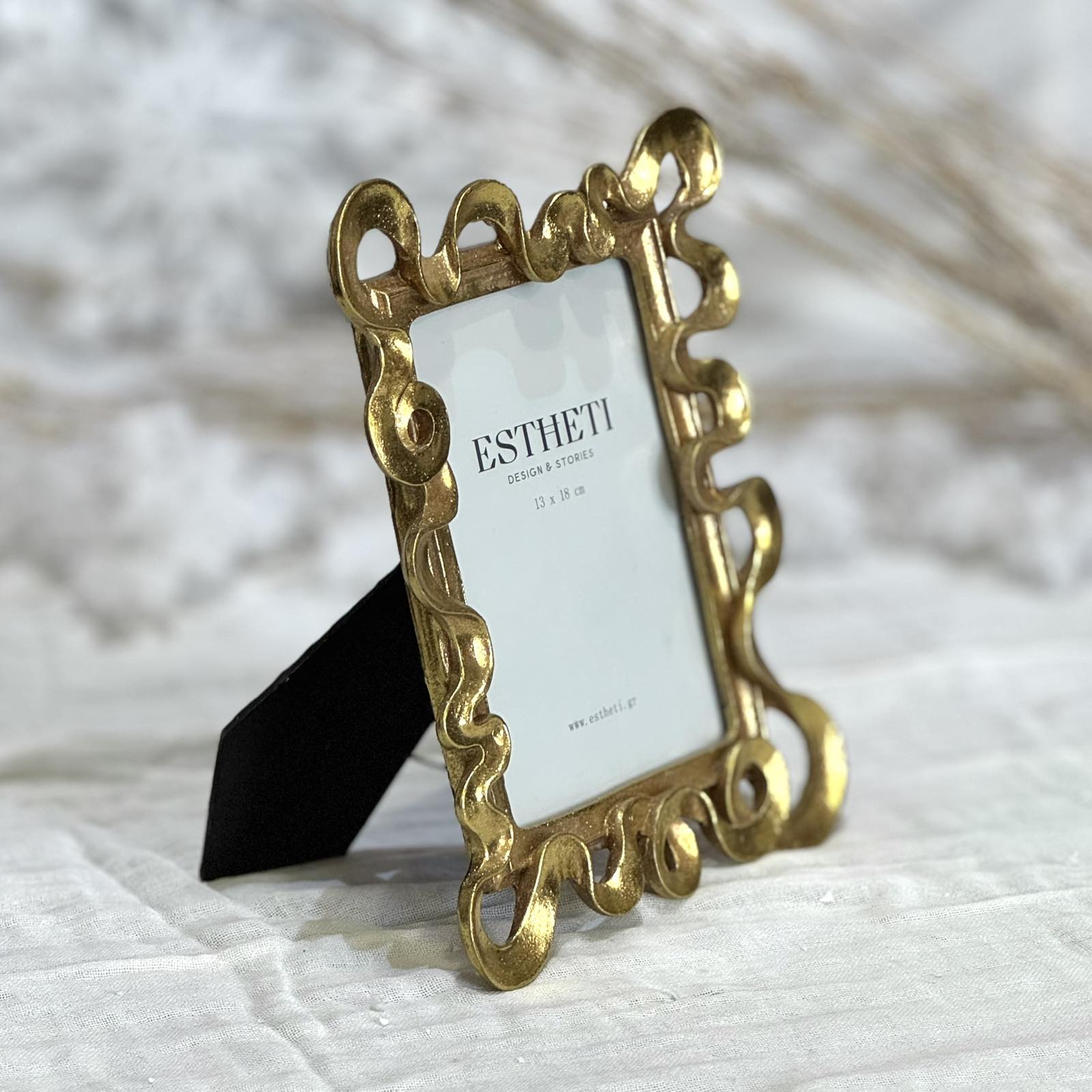 Κορνίζα από την εταιρεία Estheti σε χρυσό χρώμα με vintage σχέδιο. Είναι κατασκευασμένη από πολυρεζίνη. Η κορνίζα είναι επικαθήμενη. Η επικαθήμενη σχεδίαση της δίνει την δυνατότητα να τοποθετηθεί εύκολα σε οποιοδήποτε τραπέζι ή επιφάνεια.