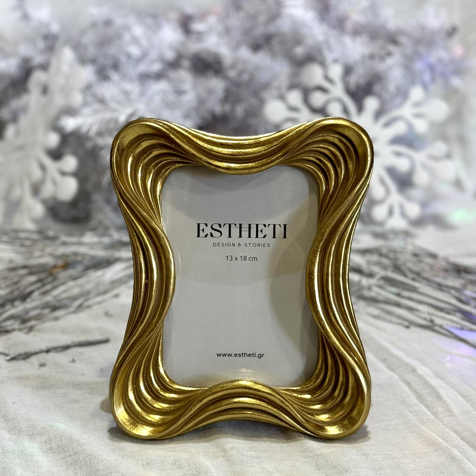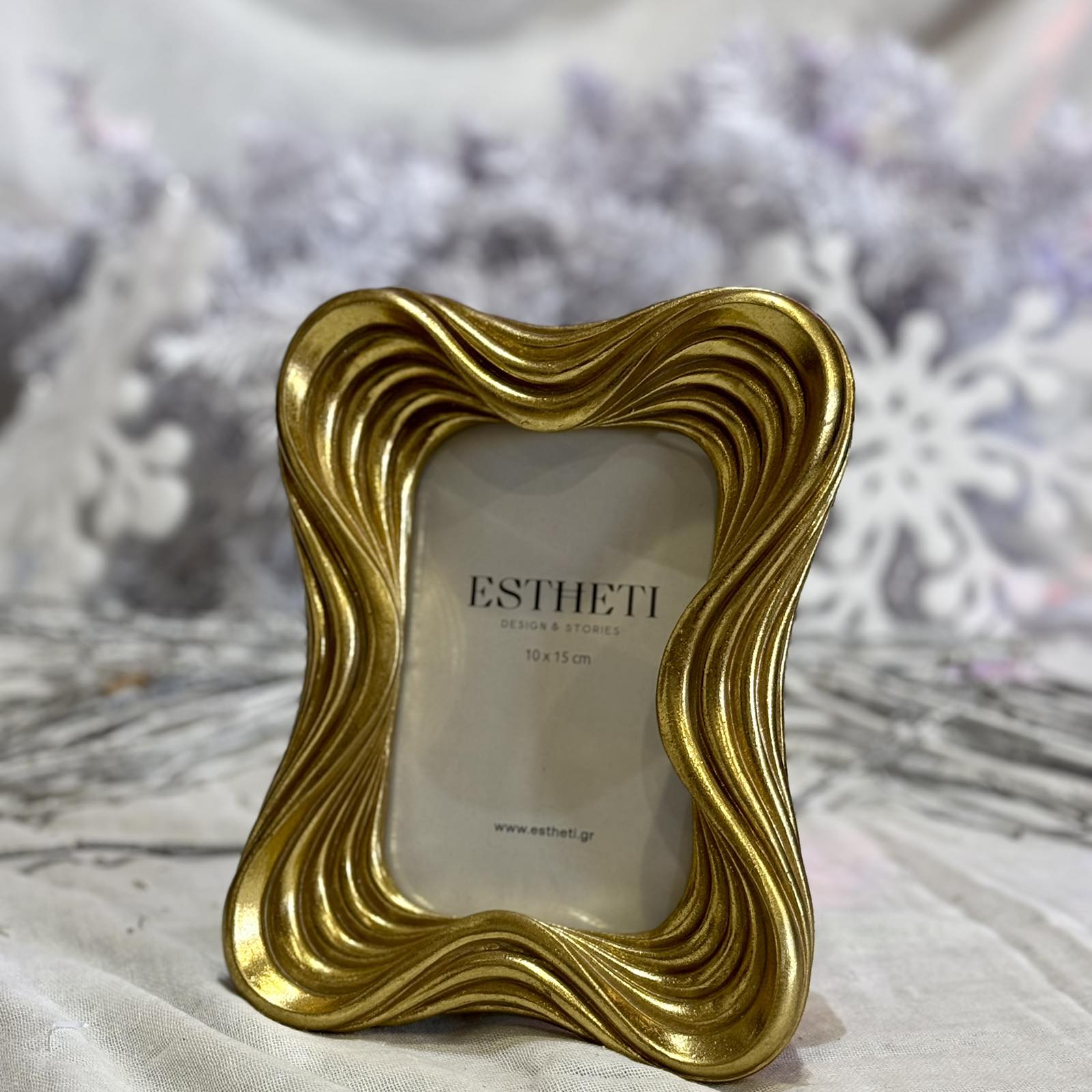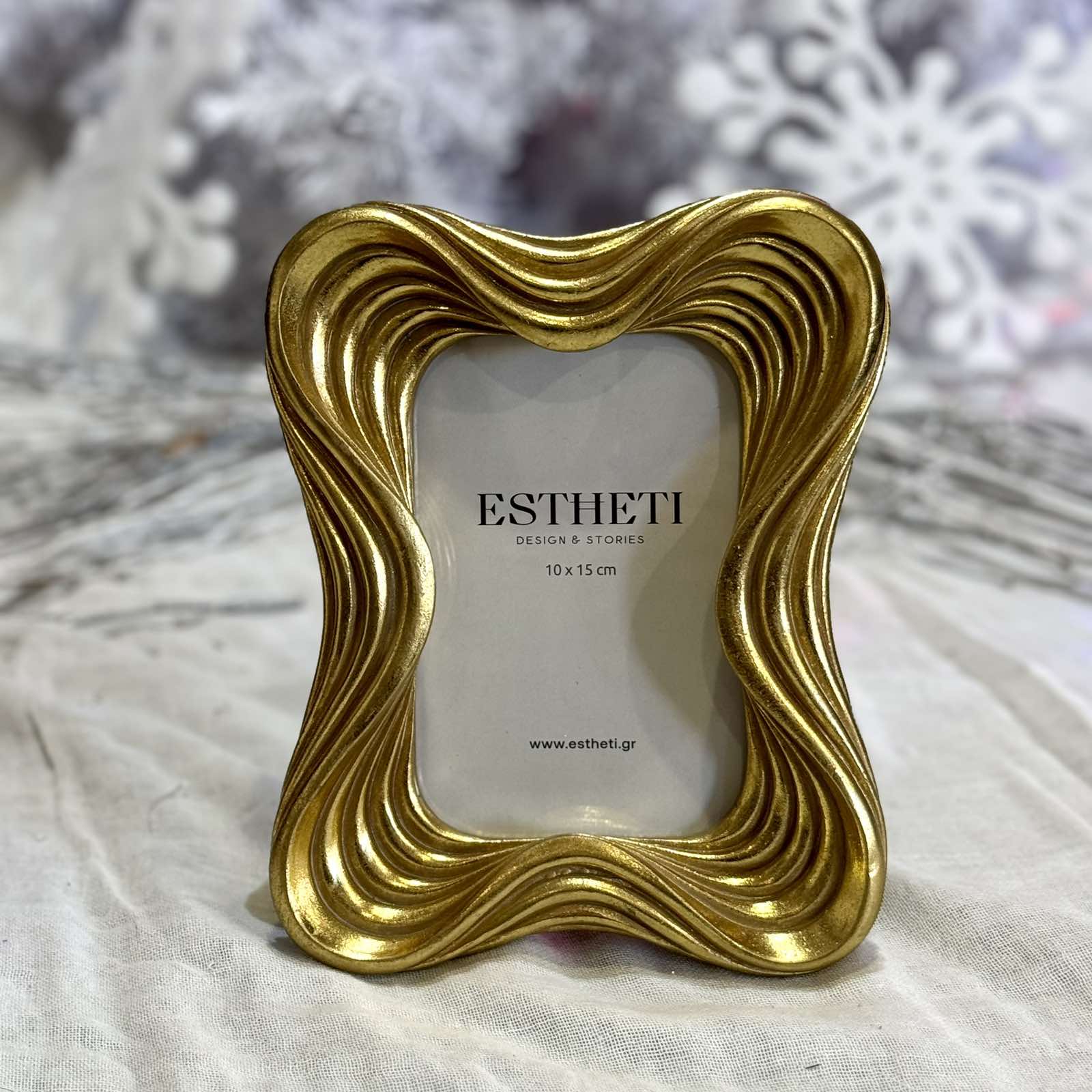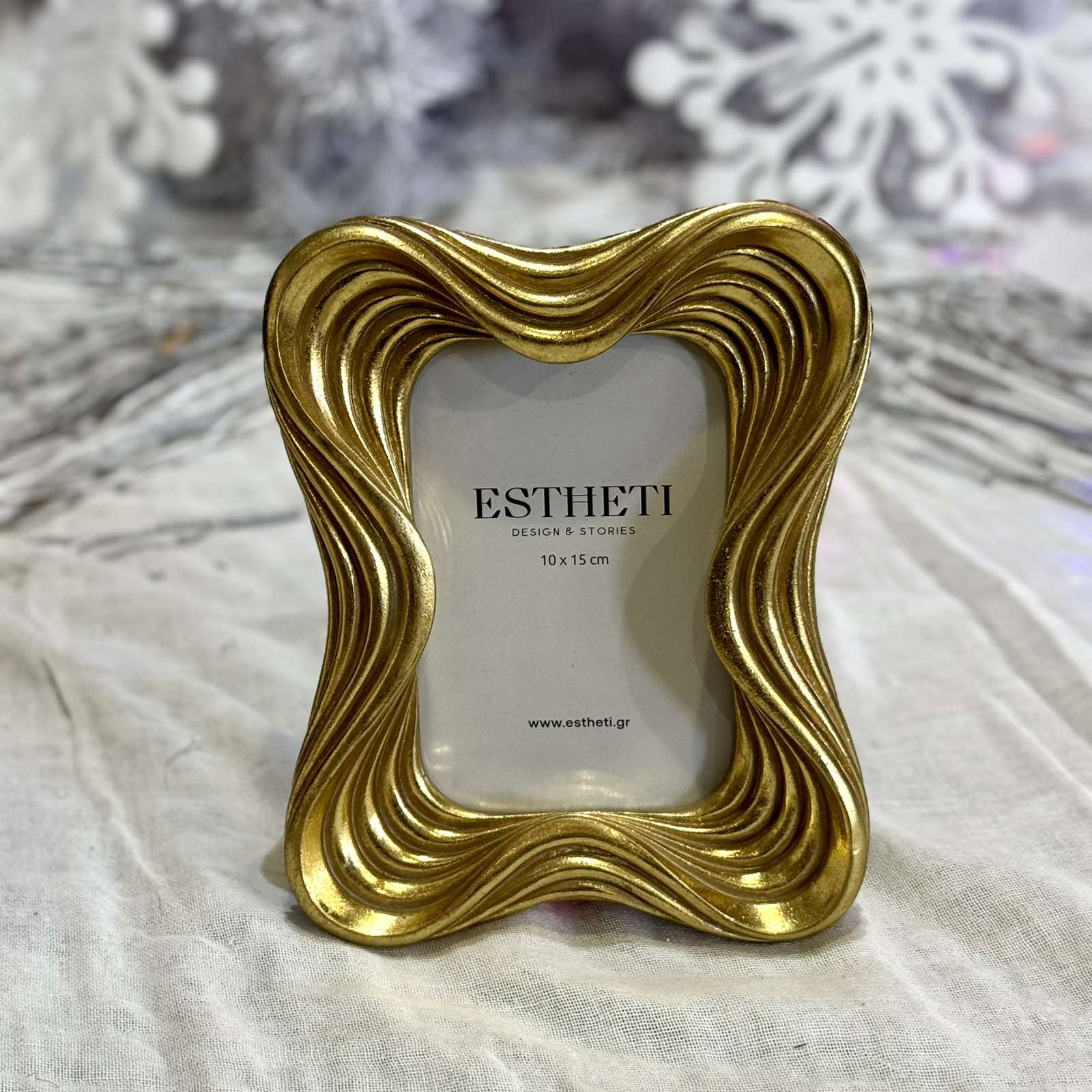 Κορνίζα από την εταιρεία Estheti σε χρυσό χρώμα με μοντέρνο σχέδιο. Είναι κατασκευασμένη από πολυρεζίνη. Η κορνίζα είναι επικαθήμενη. Η επικαθήμενη σχεδίαση της δίνει την δυνατότητα να τοποθετηθεί εύκολα σε οποιοδήποτε τραπέζι ή επιφάνεια. Φυλάξτε τις πιο ξεχωριστές στιγμές της ζωής σας σε μια μοναδική κορνίζα.