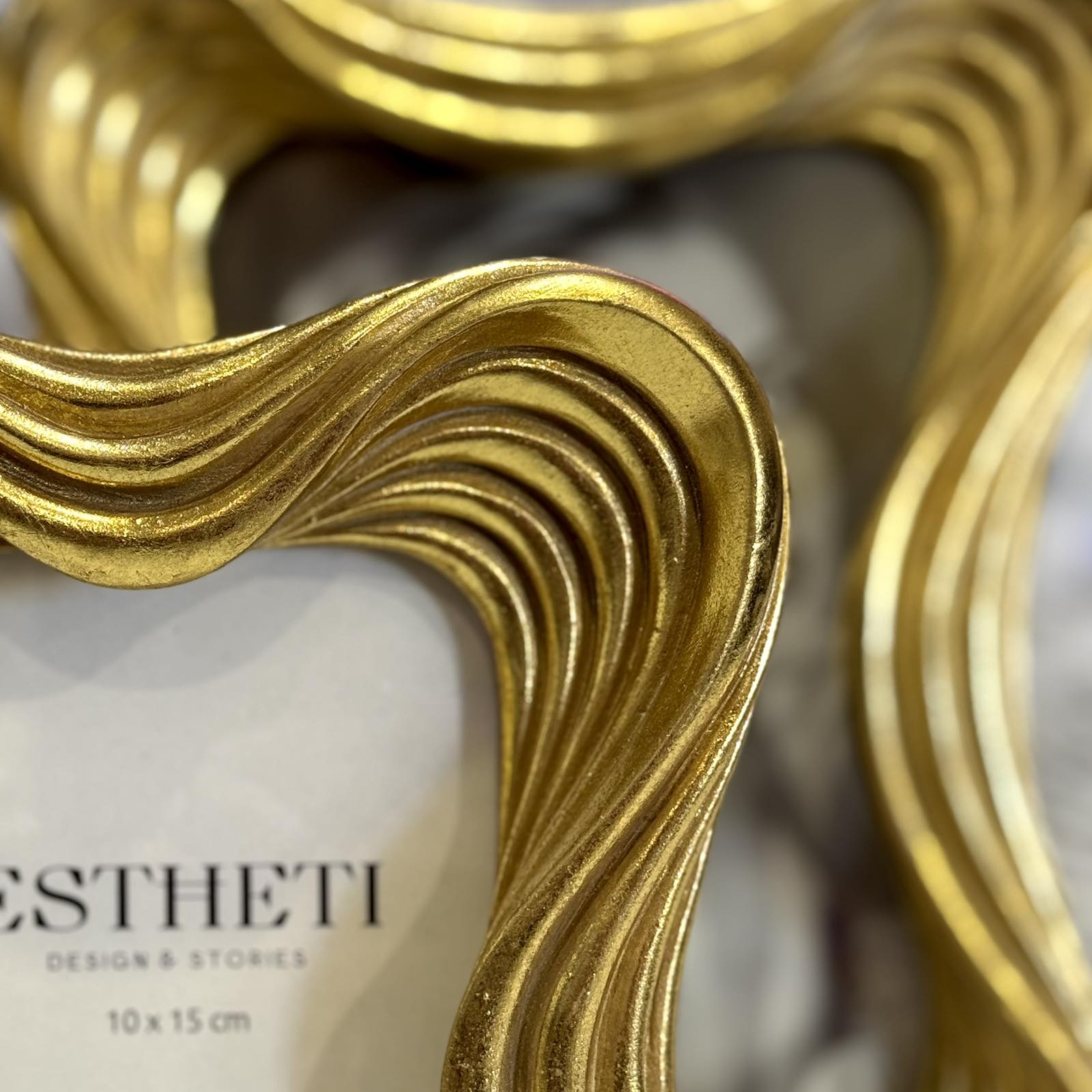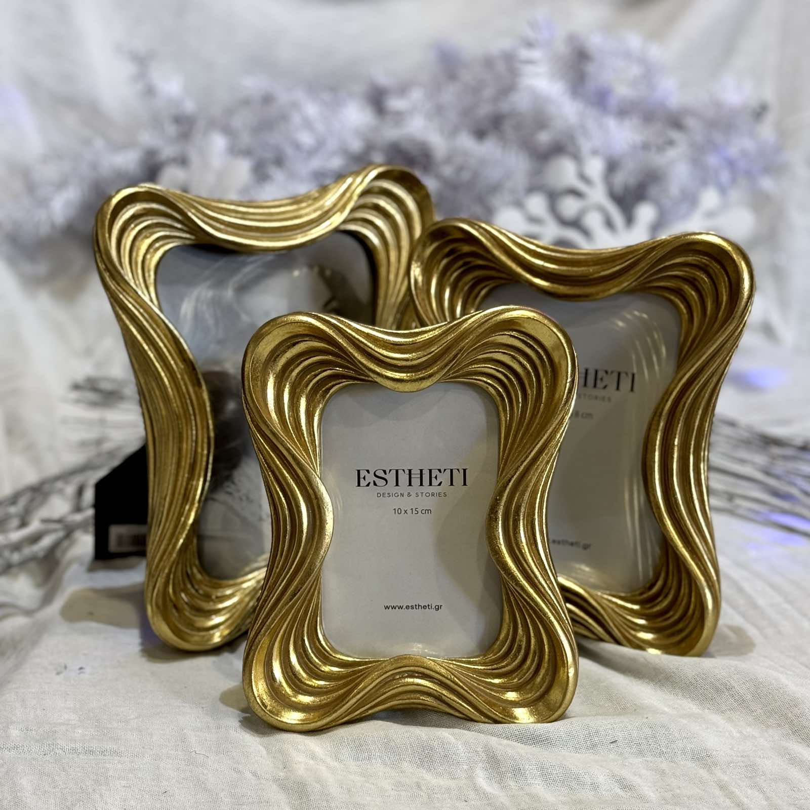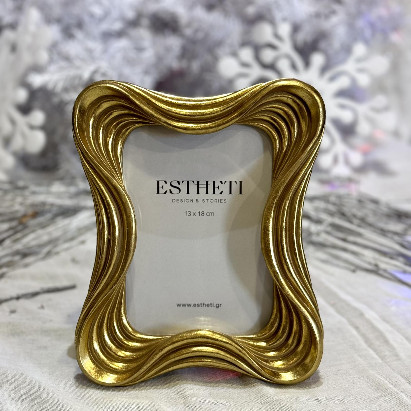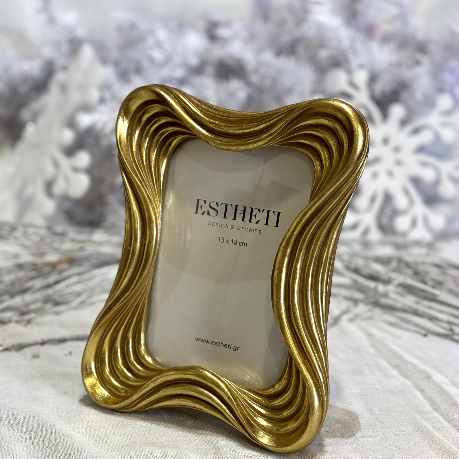 Κορνίζα από την εταιρεία Estheti σε χρυσό χρώμα με μοντέρνο σχέδιο. Είναι κατασκευασμένη από πολυρεζίνη. Η κορνίζα είναι επικαθήμενη. Η επικαθήμενη σχεδίαση της δίνει την δυνατότητα να τοποθετηθεί εύκολα σε οποιοδήποτε τραπέζι ή επιφάνεια. Φυλάξτε τις πιο ξεχωριστές στιγμές της ζωής σας σε μια μοναδική κορνίζα.
